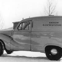 Liten gutt, Jan B. Steen, på vei til byen etter skyller. Traktoren: "Gråtass", Ferguson 1952 modell. Tilhengeren: Bygd i Skoger av smeden Olav Smerkerud. Den kunne utstyres med høygrinder eller som her, som flatvogn. Den hadde fire hjul og kunne også brukes med hestedrag. Her er den fylt opp med tønner for å hente skyller på Åskollen og Tangen.