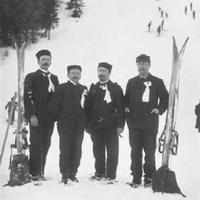 Stolte hoppere etter premieutdelingen i Konnerudkollen hoppbakke. Bildet er sannsynligvis tatt tidlig på 1900-tallet. Vi har dessverre ikke flere opplysninger om bildet.