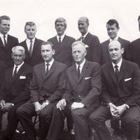 • I forbindelse med Skoger Idrettslags 50-årsjubileum i 1969 sto et nytt klubbhus med garderobeanlegg ferdig. Dette klubbhuset brant 2. oktober 1979. Et nytt klubbhus i to etasjer og med full kjeller ble reist og ferdigstilt våren 1981. Her ser vi klubbhuset presentert av styret i jubileumsåret 1969 - slik det så ut den gang. Fra venstre: Bjørn Moen, Tore Bording, Frank Jørgensen, Arthur Solbakken, Egil Arenth (formann), Bjørn Lehn, Oddvar Lajorde, Jonn Borge, Stein Fretheim, Hans Gundesø.