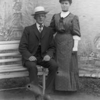 Glassplaten er skannet og behandlet av Fotohuset, Drammen. John Monsen Gram f. 1845 d. 1929 og hustru f. Hatleberg, fra Borgund i Sogn. De bodde først på Stensmyren i N. Eiker. I 1911 ljøpte de b.nr 3 av Langum, " Eriksbrøten ", som de solgte igjen i 1917. De hadde 7 barn.Ett av dem Ole Gram var kjøpmann i Rødgt 1. Fotograffens besteforeldre eide dette huset tidligere.Oles sønn Arthur drev som kjøpmann her i mange år. Huset bøe revet i 1980.og et nytt bygget i Rødgt. 1Bl. a. er barermester John Gram barnebarn av John Monsen Gram. De har mer etterslekt i Drammen, Oslo, Tønsberg, Konnerud