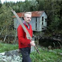 Nils Borge, Vestre Borge ved vannhjulet i Borgesaga som ligger ved bremsa. Ved full drift har vannhjulet en effekt på 40 hk, Les mer i Historielagsnytt nr. 1 2007.
