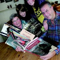 Fam. Lio på Røyseplassen koser seg med bøker, hefter og Historielagsnytt fra historielaget. Fra v.: Gry Marie, barna Fredrik og Benedikte - og far sjøl Jan Tore