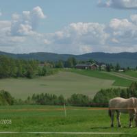 Gården Løyse i bakgrunn. Huset i forgrunn tilhørte Simen Horgen (1906-1977). Han var gift med Klara f. Dyrhaug (!907-2000). De fikk to barn Eil Karin f. 1942 og Tone f. 1946. Simen Horgen var en dyktig kunstmaler. Han har blant annet laget maleriene i både Skoger og Konnerud kapell. Han drev også en tid snekkerverksted med produksjon av dører og vinduer. Snekkerverkstedet er ombygd til bolighus. Jarlsbergveien 560. -