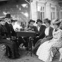 Glassplaten er skannet og behandlet av Fotohuset, Drammen. Venner på tur til Konnerudkollen Turisthotell - 1910 Synnøve Gulbrandsen - Bernhard Haugen - Gunda Haugen - Hakon Hagen - Ludvig Nilsen - Anna Sjønnesen - Lina Larsen. Konnerud Sanatorium ble bygget på gården Eskerud i 1896. Byggherre var: Grosserene Brecke, Rudolp og Andresen. Senere overtatt av hotelleier Jens Henriksen fra Tønsberg som utvidet til hotell. Etter første verdenskrig omdøpt til Konnerudkollen Turisthotell, drift til ca. 1940. Etter krigen ble hotellet benyttet som en underavdeling av Univerisitet i Oslo for 107 norske kostholdsstudenter som studerte engelsk over to semestre. De bodde på hotellet sammen med sine lærere. Denne form for college var en ny form for universitet i Norge. Kort varighet, fordi hotellet ble solgt til Europahjelpen i 1949 som mottaksstasjon for flyktninger .Siden brukt til kursted. Hotellet ble ombygd til det ugjenkjennelige i 1950. Staten overtok hotellet vedrlagsfritt i 1951 og det ble brukt som en underavd. til Lier sykehus i 1956. Hotellet brant sommeren 1967. -
