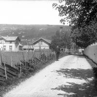 Glassplaten er skannet og behandlet av Fotohuset, Drammen. Til v. Strømsgodset Ungdomsforening`s lokaer. Rett fram, Rødskog gamle skole. Til Høyre konsul K. Myhres hus som fra 1914 ble pleiehjem. -