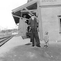 Skoger stasjon i påsken 1933. Skoger meieri i bakgrunn. Foran kornmagasinet. Jernbanen var den gang smalsporet. Andrea Huseby (1865-1941) , mor til Gerd Nina Boman, står og ser på "Understastasjonsmesteren". (Stolpe utkledd av Gerd Nina). Gutten heter Odd Tømmervik og er fra Oslo. Andrea Huseby var spesielt interressert i dyrebeskyttelsen. Fått sølvmedalje for sitt arbeid. Æresmedlem. -