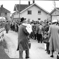 17-mai bildet fra ca 1950 viser Svein Helling’s bussgarasje til høyre på bildet. Veistumpen «Skrabben» ligger mellom garasjen og daværende Gramsborg Landhandleri på Konnerud.. (nå (2014) Halvorsen trafikkskole). I garasjen var det plass til 4 busser. På det kaldeste på vinteren måtte sjåføren inn og fyre opp en vedovn ved 4 tiden slik at det ble litt lunk og bussen kunne starte lettere. Under garasjen var det ei populær smie (kalt Kjøia) hvor ungene trivdes ved besøk. Bildet er tatt av Olaf Rustand og midt på bildet ser vi hans bror Øyvind Rustand med datteren,Randi, på armen.