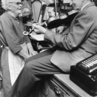Det var mye morro på Heimtun Landhandleri, også bak disken. Her spiller kjøpmann Bjarne Eriksen for fruen.