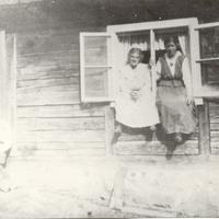 Bryggerhuset på Eskerud, kalt " Lillebo ". I vinduet : FrkHenriksen og Else Nilsen , de hadde syatelier i Drammen. I døropningen : Borghild Hansen Eskerud, ,datter av Ole Hansen Dyrmyr fra Jenserud v/ Dørsjø - Ø. Eiker Kommune