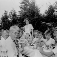 På baksiden av bordet. fra H.: Tor Ekholt.- nn- nn-Marit Kari Rustand-Jorunn Prøis ( født Prøis ) Dorthea Thorrud (stående) - På forsiden.: Svein Prøis Echholt - Borgar Echolt ( titter frem ) -nn - Gunnar Prøis -nn- nn- Ole Karl Prøis - Brunsvik. Bidet er tatt i Hauanveien 14. Olaf Echolt sitt nye hus. Fødselsdagsfeiring hos Tjomsland.
