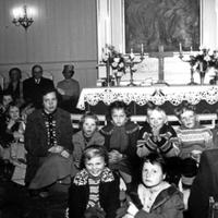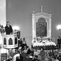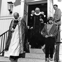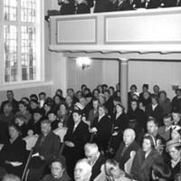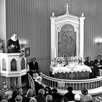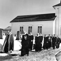 Konnerud gamle kirke ble innviet den 28. mars 1858 som anneks til Skoger. Feiret 100-årsjubileum 30 mars 1958 med biskop og mange prominente gjester.Prosesjonen av prester og menighetsråd på vei ut etter gudstjenesten: Foran Biskop Bjarne Skard (1948-1961), Prost E.G.Storesund, Sogneprest T.I.Engeland,(1955-1969), Tidligere Sogneprest Andreas Birkeland 1939-1954) ,hjepeprest Jan Aas ( 1955-1966) , sogneprest Garpestad og fra menighetsrådet: Anna Solbjørg, Arne Steen Karlsen,(delvis kjult) Einasr Mortensen, Knut Fjellvang, Torolf Thorvaldsen, ukjent.