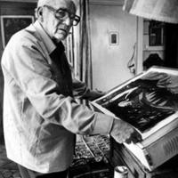 • Dette er kunstmaleren Kai Fjeld, her mellom to stuer i sitt "kråkeslott" i Strandveien på Lysaker forteller hans niese, Trine Borge Johansen. Fra sin fetter, Sindre Fjeld, har hun fått følgende utfyllende opplysninger: "Motivet på silketrykket som ligger på lysbordet, heter "Menneske". Det finnes i 8 ulike varianter, alle laget i 1984. Fotografiet er tatt av fotograf Sverre Bergli, antakelig i 1984. Kai Fjeld, 1907 - 1989.