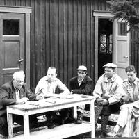 • Tekst: Torill Juel Toppledelsen i KIL hadde møte foran det første klubbhuset som var ferdig i 1947. (Et lite tilbygg i 1952. Det besto av 2 garderober. (for borte- og hjemmelag). Første byggetrinn i nåværende klubbhus kom i 1957 og ble påbygd fler ganger siden. Her er banekomiteen : Fra venstre: Axel M Amundsen (1899-1970), Olaf Rustand, Arne Berntzen (1920-1996), Harald Wisting (1909-1988) og Olaf Nilsen (1922-2004)