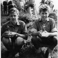 • Unge orienteringsløpere. Til venstre Thor Mortensen f. 1943 og Rolf Levin Jensen f. 1945. I et orienteringsløp på Kongsberg i 1959 vant Thor eldste gutteklasse. Rolf vant yngste gutteklasse. Premien som de sitter med i hendene er en bergmann med en liten sølvklump.