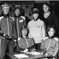 Fra venstre bakerst kjenner vi igjen: Erik Saugerud, Lars Baklid, Øivind (Andersen) Bergstrand og Henning Gaarder (o-leder) Foran: Kjersti Sommerstad Juveli og Merete Ruud Bildet er tatt ca. 1980