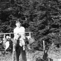 Fangst på Konnerud. Thorbjørn Tollefsen med ukens fangst i Konnerudskogen. Tatt ved Langmyrdammen.