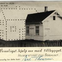 • Kort som ble brukt ved innsamling av midler til tilbygg på Bedehuset i 1953. Bedehuset er fra 1909. Det var så mange med på søndagsskolen som førte til behovet for utvidelse. Harald Thorrud (1908-1986) ga etter krigen tilbud om gratis tomt under forutsetning av at menighten greide å samle inn 2500 kr. som tilsvarte verdien på tomta. På medlemsmøte 17. januar 1953 ble det besluttet å bygge ut eksisterende bedehus Det var dugnad blant medlemene som gjorde at utvidelsen av huset ble en realitet. Det var Erling Thoresen (1903-1983) som var ansvarlig for kortet.