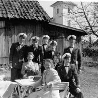 " Gomperud" ved Konnerud gamle kirke. Bak fra v.: Finn Andresen, Ragnar Thomassen, Per Tollefsen. Åge Ravn Hansen, Randi Karlsen , Odd Karlsen. Ester Ruud, Fru Kre-- Astrid Bliksrud