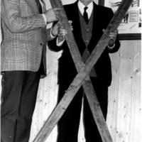Oskar Mortensen og Bjørn Skalstad (med skiene) på KIL's klubbhus på Sletta. Skiene ble gitt i gave til KIL og heger på klubbhuset.