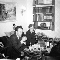 Avskjedsselskap i Konnerudgt. 324 for Jørgen Prøis og Berit Thors som skal emigrere til Canada. Jørgen reiste først, noen måneder senere reiste Berit. De giftet seg i Vancouver, B.C. og fikk 2 jenter, Jean Beate (født i 1958) og Liss Irene (født i 1959). De flyttet fra Vancouver til Bella Coola og bodde der et år før de flyttet hjem til Konnerud høsten 1961. Randi Jacobsen, Solveig Tollefsen, Ivar Tveten, Berit Thors (senere gift Prøis), Jørgen Prøis.
