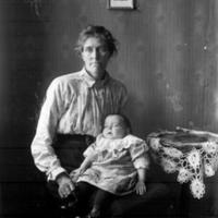 Marie Helgerud. Rødgt.20, med minstebarnet. Marie er i slekt med fam. Halvorsen påStubberud, en av Konneruds elste slekter.Mannen het Martinius Helgerud og har navn etter Helgerudplassen ved grnsen mot Nedre Eiker. Han er f. på Nysetra, langt inne på skauen. Tre sønner, Bjarne, Birger og Arvid, som siden reiste til Canada.