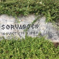 Kong Olav V åpnet Sørvangen 28. august 1984, og han skrev navntrekket sitt her.