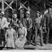 • Bildet er tatt ca. 1916 i forbindelse med oppføring av ny hovedbygning (våningshus) på Øvre Skjeldrum (bnr. 3). Fra venstre på bildet bakerst: John Skjeldrum, Jørgen Halvorsen Skjeldrum (sannsynligvis), Hanna Marie Skjeldrum, Hans Jakob Skjeldrum (sannsynligvis) , Christian Emil Halvorsen Skjeldrum (svoger av Hanna Marie), Halvor Skjeldrum, ukjent mann Foran på bildet fra venstre: Karen Kristine Skjeldrum og Hilda Olstad (kusine av John, Halvor og Karen Kristine) - senere gift (1922) med Anders Jørgensen Borge på Østre Borge.