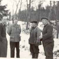 Oscar Stubberud f. 1903 har 50 års dag hjemmme på Stubberud og gode arbeidskollegar feirer dagen. Fra v.: R. Rypås, Bjørn Backmann