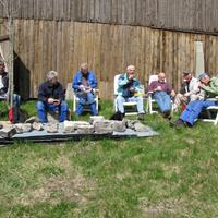 Lunsjpause under dugnaden på Skjeldrumsaga. Fra venstre: Kjell Borge Johnsen (ansvarlig elektroinstallatør) Willi Johansen Hans Myhre Reidar Halden Oscar Hauge Tom Hayden Thor Jahren