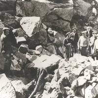 • Karl Johansen med sine 6 sønner. : Arthur, Emil, Karl, Reidar, Ferdinand og Bjarne. Bildet er tatt på Nøsted Bruk i forbindelse med utbyggingen. Bjarne var skytebas. Karl kjørte lass med lånt hest fra Ingvald Meland på Gundesø. Emil f. 26.08.1899 , døde mai 1984.