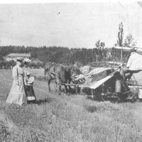 Oscar Kiær på selvbinderen som da var ny. Damene på bildet er fra v.: Frk. Nærup og fru Kiær. Den lille piken er Ingeborg Kiær, ca. 5 år gammel