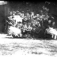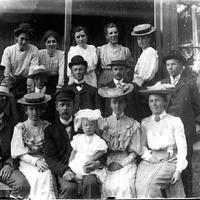 På Verandaen : Aagot, Gudrun Linseth, tanta Kaja, Thora, Hans, Kronstad, Isak, Bjerck, Aksel, Ingvald, Thora, Ivar, Helene, Maja og Elisabeth.
