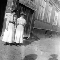 4 skolevenninner: Kristine Christensen, Karen Ellingsen, Margit Rølles og Marie Klemmetsen. Bildet er tatt i Nedre Storgt. Bragernes. ( ved Sundgt eller Gjetergt.)