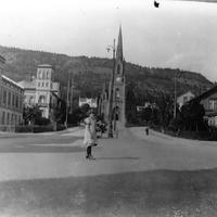 Agnes Clausen i Kirkegt. Brannstasjonen til høyre. Bragernes kirke i bakgrunnen.