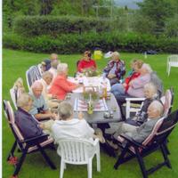 Konnerud tre og flis sitt grillparty. På venstre side av bordet: Bjørg og Kristian Langerød, Hans Haveraaen, Astrid Ringstad, Anne - Lise Prøys, Rolf og Ann Vera Svenson. videre på andre siden .: Arvid Stubberud, Inger Stubberud , Åse og Borgar Echoldt, Åsne og Kåre Knutsen