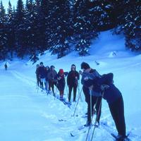 • Skoger Ungdomslag hadde skitur fra Andorsrud til Prestesetra vinteren 1966. Dette bildet er tatt på hjemveien mot Andorsrud. Første jente vi drar kjensel på er Anne Margrete Drolsum (lyst hår, solbriller), deretter følger: ukjent, Tone Horgen, Ingeborg Nilssen, Kirsti Gilhuus og Målfrid Skurdal.