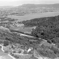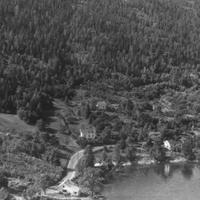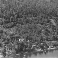 Hos rørleggermester Henry Martinsen, Lindebukta, Svelvikveien Fra v. Hvit villa og uthus med røde tegeltak Hvit villa, røde lister, grått papptak. Garasjen har samme farger Rødbrun hytte med grønt, sort papptak. To øvrige hytter er brune med sort papptak. Fra v. Sjølyst 36/19 Zachariassen Neste Henry Martinsen Lindebukta 36/4 I.Wessel, Berg