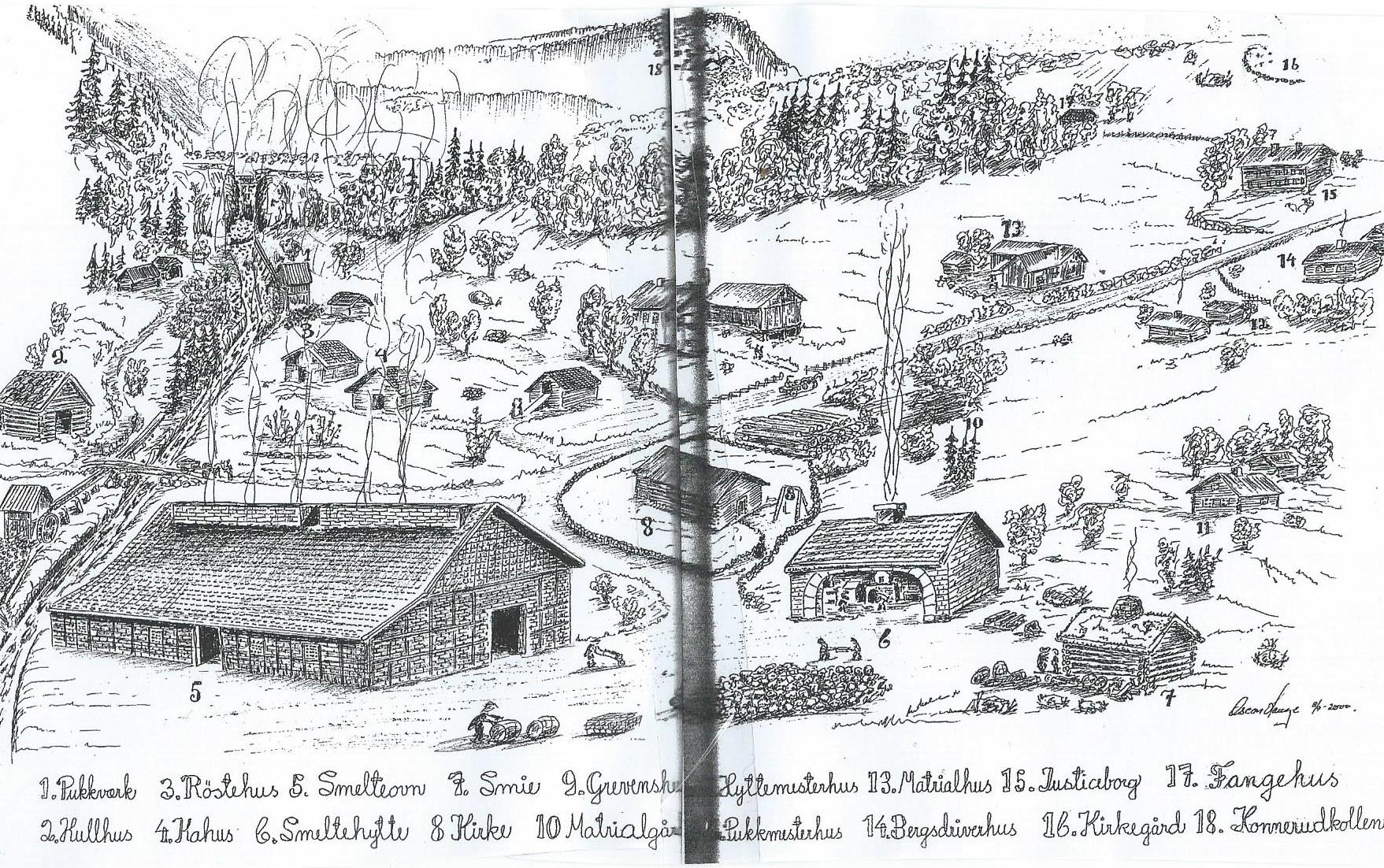 En skisse av Oskar Hauge som viser hvordan Hichmanns omfattende industriområde kunne ha sett ut ved Verkenselva nord for Hammerdammen. Hichmanns virksomhet fra 1777 til 1789. Tekst: Per Runar Thoresen