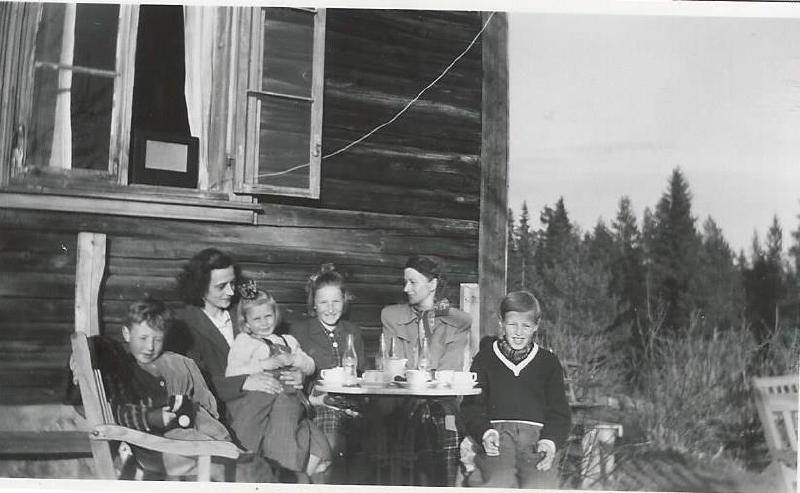 Sommertur til Nikkerud på begynnelsen av 1950 tallet. Fra V: Jan Haldor Skramstad, Solveig Halle, Mai Therese Halle(på fanget), Jorun Skramstad, Ingrid Skramstad og Erik G-rinderud..Mai Therese er søskenbarn til Jan Haldor og Jorun.
