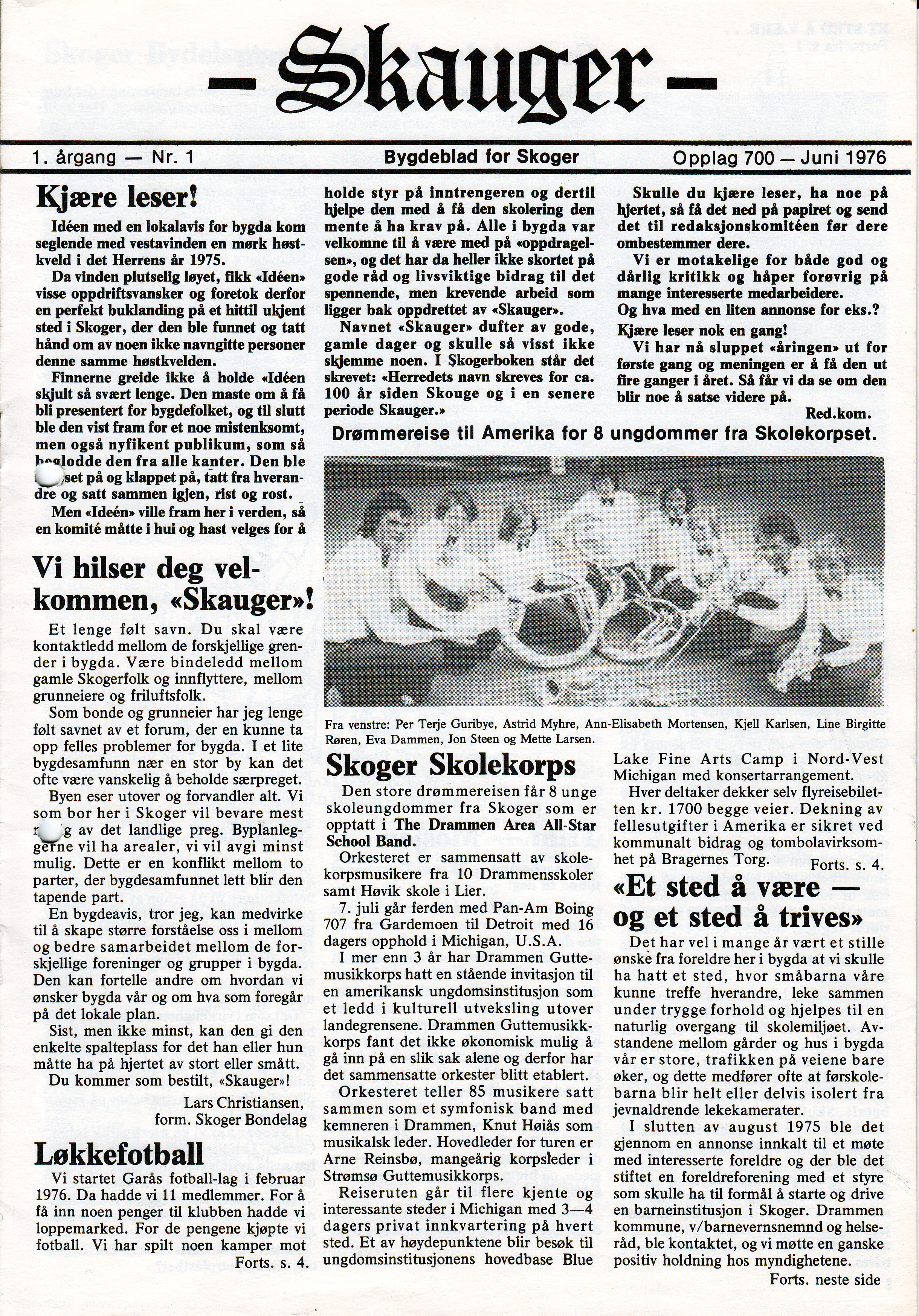 Dette er førstesiden på førsteutgaven av "Skauger", Juni 1976. Redaksjonskomitè : Steinar Hagen, Anders Chr. Juel, Reidar Halden, Berit Svendsen, Inger Hyllseth.