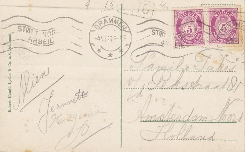 Bildet tatt fra Stordammen og Konnerudkollen Turisthotell ligger i bakgrunnen. En flott St.Bernadshund foran båten. Kortet er sendt 4 august 1925 til Amsterdam i Holland. (Se alternativt bilde) På bilde nr 43 er det utfyllende opplysninger om hotellet.