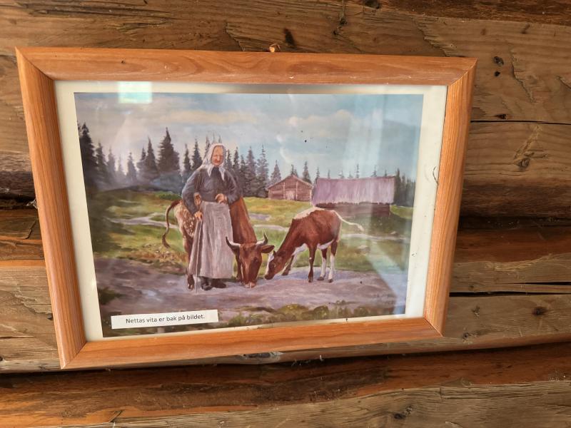 Dette maleriet er malt av Johan Bjørge Johansen og motivet fra et bilde (du kan søke opp ID 6050). Det er Netta Gravdal med kuene sine på Bjørgesetra på Vestskauen. Maleriet ble malt i to eksempler og originalmaleriet var 80x60cm. Dette maleriet henger i stua til Netta Gravdal på Bjørgesetra og Ivar Bjørge viste det for meg.