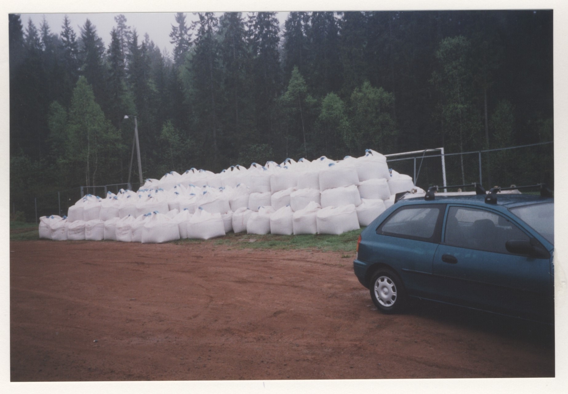Bildet: Viser en stor mengde sekker med spesialsand som ble lagt under kunstgresset på Konnerud skistadion.