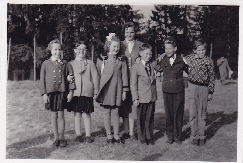 Lærerinne Eldbjørg Romenstad. 3. klasse 1954 : Marit Hansen, Jorunn Aaserud, Anne Marie Leret, Erling Havik, Terje Eriksen og Jan Jakobsen