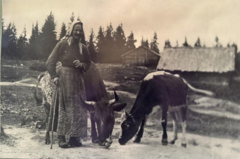 Dette fotoet er tatt på Bjørgesetra på Vestskauen. Fotoet er tatt ca 1920 og fotografen var Olaf Bøhlum. Person på bildet er Netta Gravdal (1865-1941). Disse bildene henger i stua til Netta Gravdal på Bjørgesetra og Ivar Bjørge viste dem for meg.