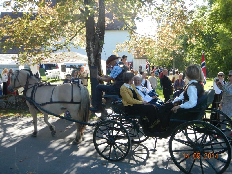 Arne Finsrud kjører her representantene fra familiene fra Sten gård og gartneri til Skoger gamle kirke. Hesten og Trilla hører til på Skalpe.