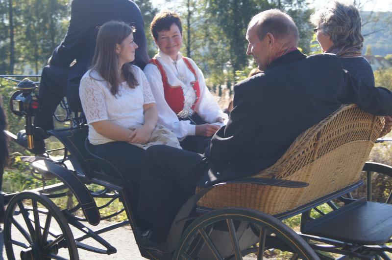 Representanter for familiene ankommer Skoger gamle kirke med hesteskyss.