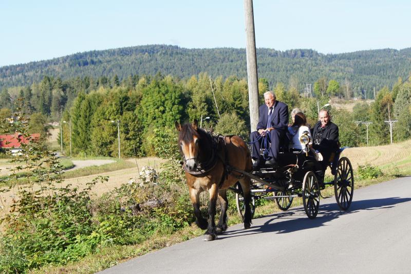 Her blir representanter for familiene kjørt til Skoger gamle kirke. Hesten og Trilla hører til på Skalpe og kusk er Hennum.