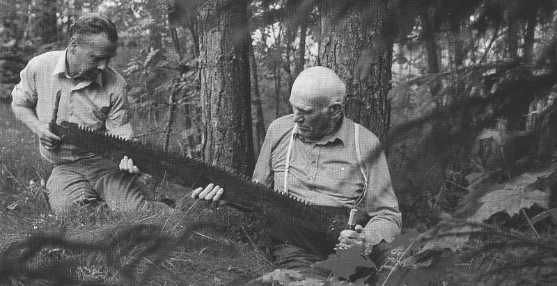 Jan Gundesø (til venstre) og Hans Steen demonstrerer bruk av tomanns tømmersag.