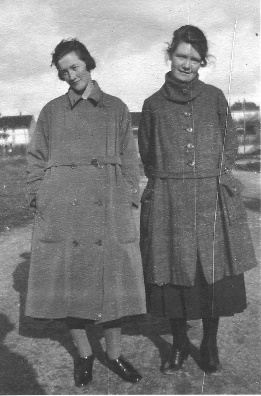 T.v. Ester Grinderud (1903-1992) f. Amundsen fra Aremark. Gift med Halvor Grinderud (1905-1977). De fikk sønnen Erik f.1941. Den andre dama er ukjent.